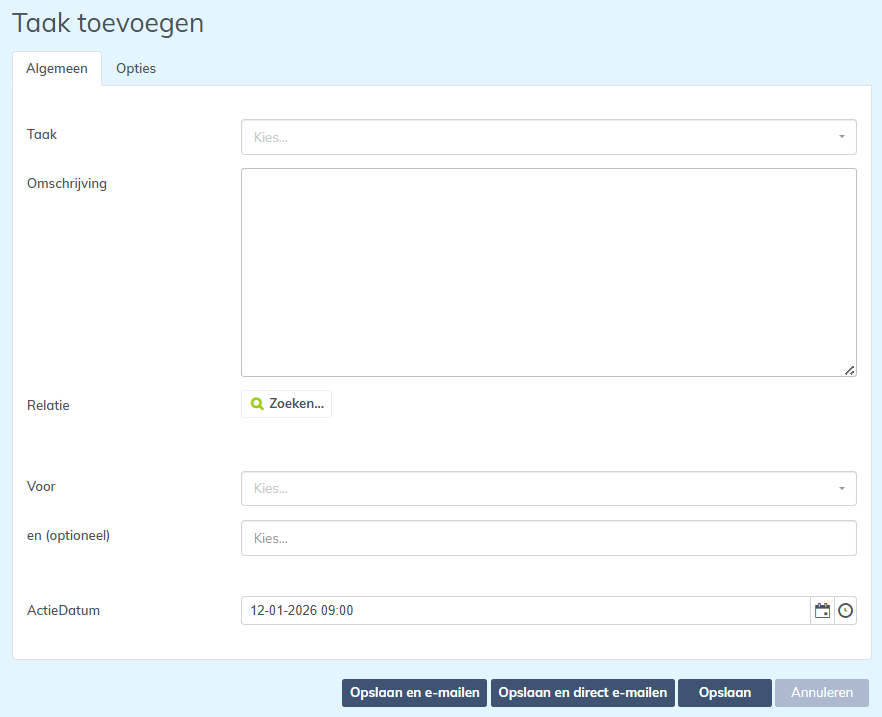 Bij het aanmaken van een taak is het veld Voor verplicht. Dit is de medewerker aan wie de taak wordt toegewezen. Daarnaast is het mogelijk om bij een taak het veld Optioneel te vullen. Dit is de medewerker die de taak als leestaak krijgt toegewezen.